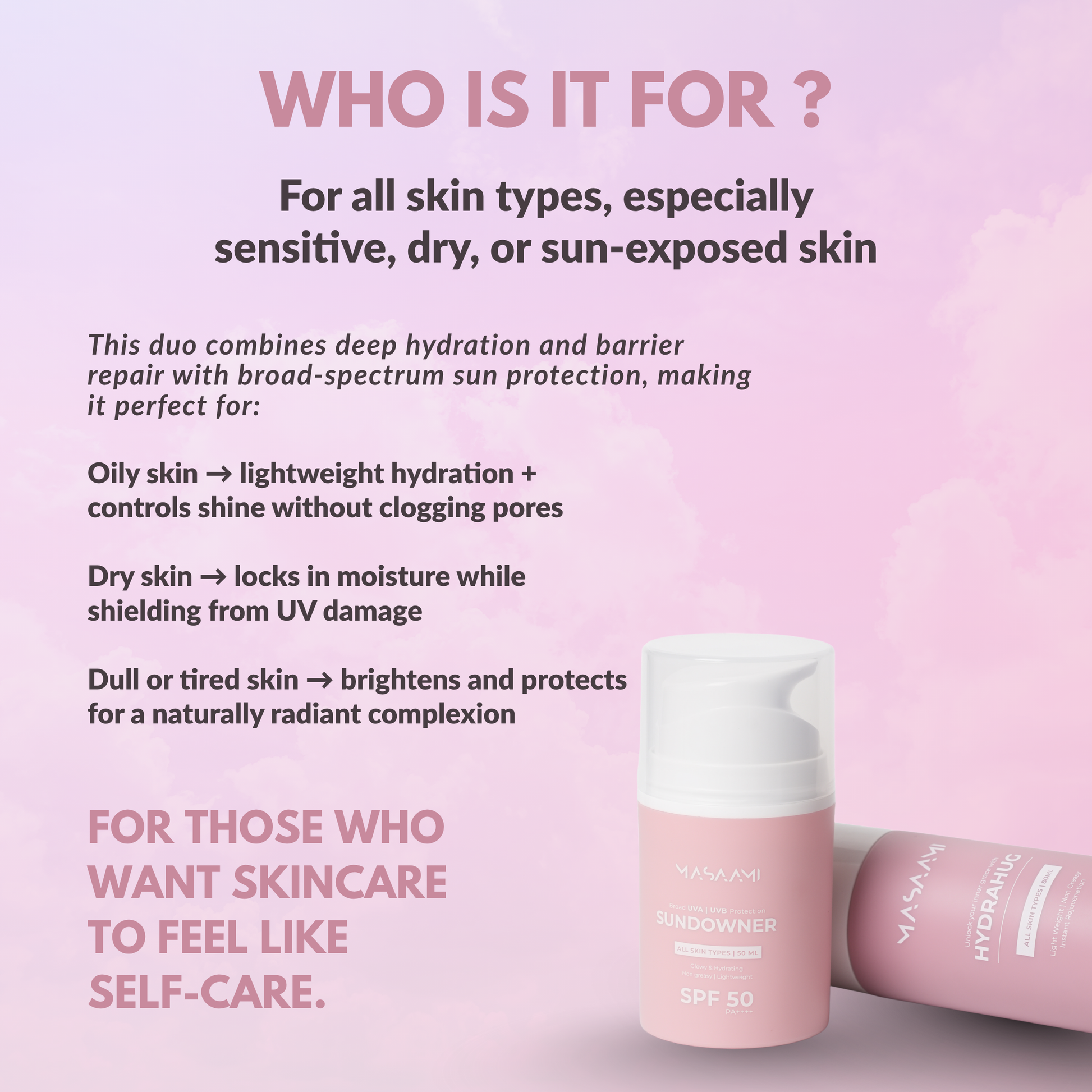 Meet the duo your skin will never want to skip. HydraHug + Sundowner brings together deep hydration and daily protection: your perfect AM ritual, simplified.
